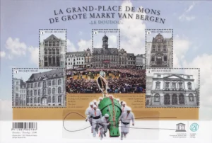 De gegraveerde reeks ‘Promotie van de Filatelie’ met de centra van Belgische steden, wordt verdergezet met de Grote Markt van Bergen. Dit gebeurt in het kader van ‘Bergen, Culturele Hoofdstad van Europa’. Het jaarlijkse folkloristische feest ‘Le Doudou’ krijgt hierbij bijzondere aandacht als UNESCO Immaterieel Cultureel Patrimonium.