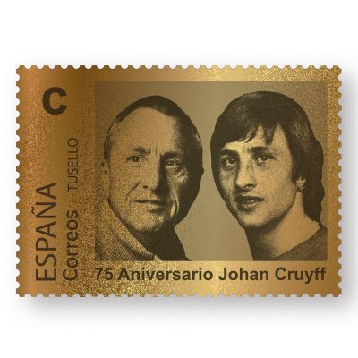 Spanje (2022): Gouden postzegel Johan Cruijff met jonge en oude profielfoto. Tusello = persoonlijke zegel.