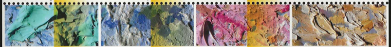 Aan de onderkant van het postzegelvel staan vier fragmenten uit sneeuwschilderijen met grillige reliëf-structuren met hoge en lage gedeelten, waarin schaduwen zijn te ontdekken. Op afstand lijkt dit werk toch vrij egaal van kleur te zijn, dat Wolkers karakteriseert als “Sneeuwstormen van kleur, die vol zitten met gedachten en herinneringen.”