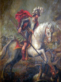 Sint-Joris verslaat de draak, naar een schilderij in de Sint Gertrudiskerk te Beesel. Bron: Wikipedia.