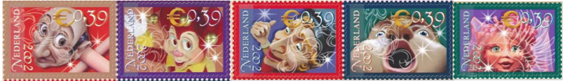 * Op twee postzegels (Doornroosje & Kleinduimpje) zijn enveloppen als deelfragment in de afbeelding opgenomen. Op de Hans en Grietje-postzegel draagt Hans een stapel kerst-paketten. Deze drie PostNL-attributen past ontwerper De Bruijn subtiel en afgewogen toe. Hulde!