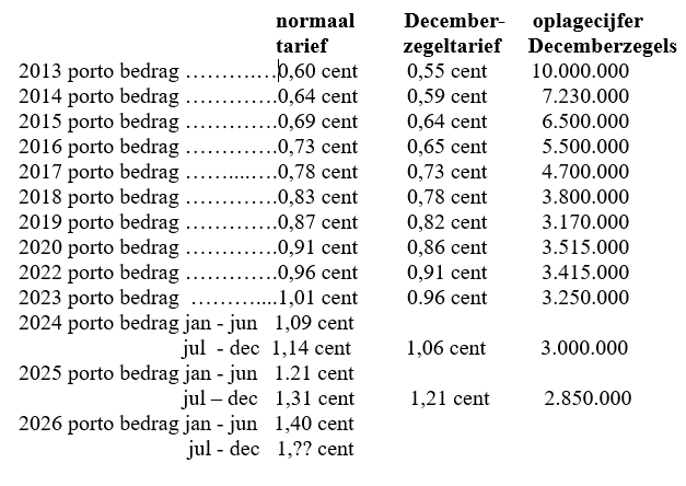 Uit onderstaande cijferreeksen blijkt overduidelijk de achteruitgang van het gebruik van de Decemberpostzegel. Reden / oorzaak? Versturen van kerst- en nieuwjaarskaarten wordt tegenwoordig alleen maar door 60-plussers en nog hoger bejaarden mondjesmaat uitgevoerd. Jongeren maken gebruik van moderne communicatiemiddelen.
