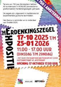 Tot en met 25 januari 2026 is in het Postkantoor van Museum Het Schip een expositie met herdenkingszegels te zien. Deze expositie is tot stand gekomen in samenwerking met AGA LAB ter ere van het 750-jarige bestaan van Amsterdam. AGA LAB maakt al 67 jaar deel uit van de geschiedenis van onze stad en viert mee met een speciale expositie van herdenkingszegels. Alle prenten zijn in AGA LAB gedrukt met diverse grafische technieken. Van iedere deelnemende kunstenaar zal een zegel worden geëxposeerd in het oude postkantoor van museum Het Schip en er zijn ook exemplaren te koop in de museumwinkel. Daarnaast kunt u ook de vaste en de tijdelijke expo’s van het museum Het Schip inclusief de rondleiding in het Postkantoor zien.