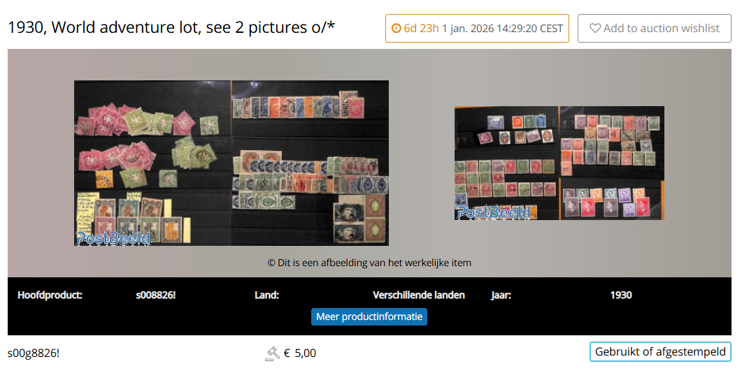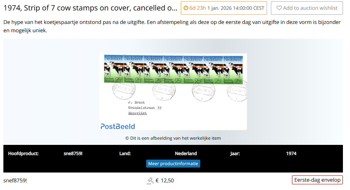 Iedere eerste dag van de maand houdt PostBeeld een kleine online veiling met daarin bijzonderheden, persoonlijke zegels, stadspost, gekke dingen en kleine collecties. Kortom allemaal kavels met iets wat in onze normale webshop meestal niet te vinden is. De eerstvolgende veiling loopt af op nieuwjaarsdag en bieden is nu al mogelijk.