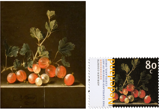In de periode juni–september 1999 organiseerde het Rijksmuseum een overzichtstentoonstelling van Nederlandse stillevens. Schilderijen van onder anderen Adriaan Coorte en Carel Fabritius fungeerden daarbij als publiekstrekkers. Ter gelegenheid van deze zomerexpositie werd een speciaal postzegelvel uitgegeven, waarop van ieder schilderij een groot en herkenbaar deel van het oorspronkelijke werk is afgebeeld. Dit blog bespreekt het laatste deel van dat postzegelvel.