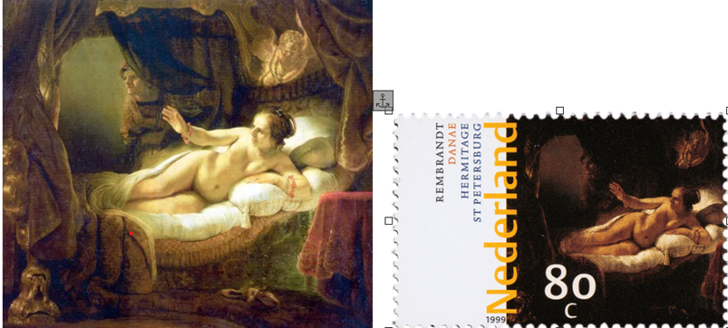 Rembrandts vrouw Saskia stond model voor Danaë. Met dit schilderij is zij voor de vierde keer afgebeeld op een Nederlandse postzegel.