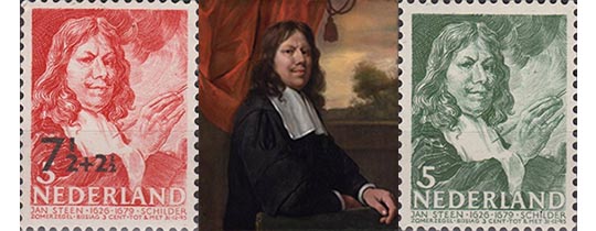 In 1935 worden voor het eerst de zomerzegels uitgegeven. Ieder jaar een serie met een toeslag voor Sociaal en Cultureel werk. Deze zomerzegels bestonden de eerste jaren uit een portrettengalerij van beroemde Nederlanders. Zo ook in 1940. Wat ik bijzonder vind is dat Jan Steen twee keer in deze serie is opgenomen. Een groen exemplaar met frankeerwaarde van 5 cent en een rood exemplaar met een frankeerwaarde op de oorspronkelijke zegel (ook) van 5 cent maar met een opdruk van 7,5 cent. Wat zou de reden zijn geweest van deze opdruk? Een foutje om twee keer een zegel van 5 cent te drukken? Of was er ook behoefte aan een postzegel van 7,5 cent en heeft men dat op deze manier opgelost?