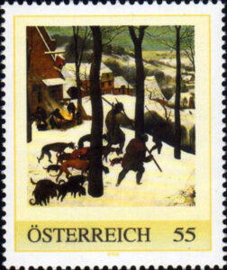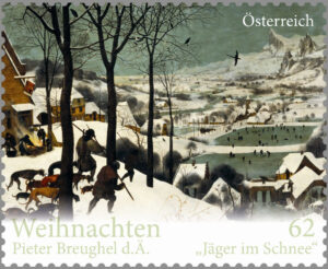 Winterlandschap met schaatsers en vogelknip is geschilderd in 1565. Het toont winterpret in een ondergesneeuwd Brabants dorp, er zijn schaatsers en een vogelknip te zien. Het echtpaar Delporte liet het kunstwerk in 1973 bij testament na aan de Koninklijke Musea voor Schone Kunsten van België te Brussel. Hierboven de zegel als onderdeel van het blok.