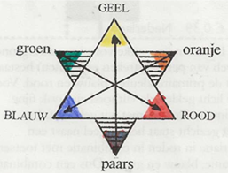 Kleurenleer: voorste driehoek primaire kleuren en achterste driehoek secundaire kleuren.