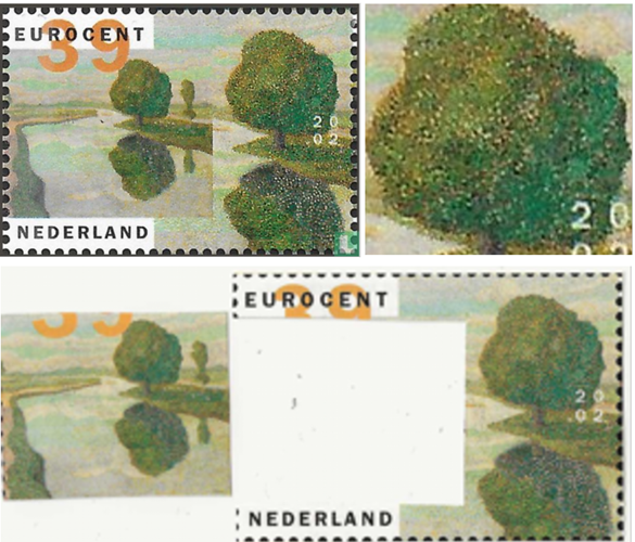* Het landschap met rivier en boom op de postzegel is op ongebruikelijke wijze vòòr een vergroot fragment van het rechter deel van het schilderij geplaatst. Meestal staat een uitvergroot detail vòòr de totale afbeelding.