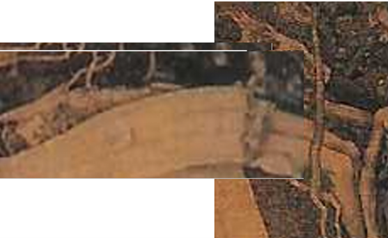 * Twee bomen met knoestig neerhangende, treurende en grijpgrage takken (op de achtergrond) onder-steunen door vorm, beweging en richting beide zwevende figuren. Het geheel is in een onwerkelijk, naargeestig en ,neerslachtig landschap geplaatst.